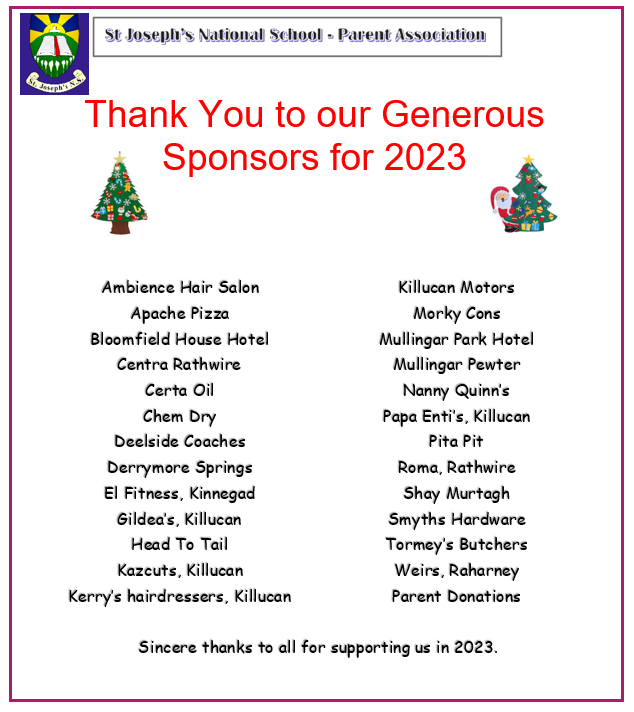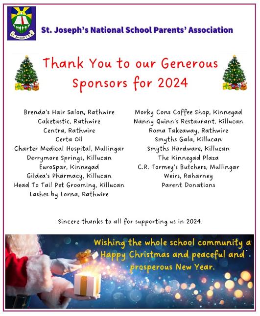 The Parent's Association would like to thank all of our generous sponsors for donating prizes to our Christmas raffle and for supporting us throughout 2024.