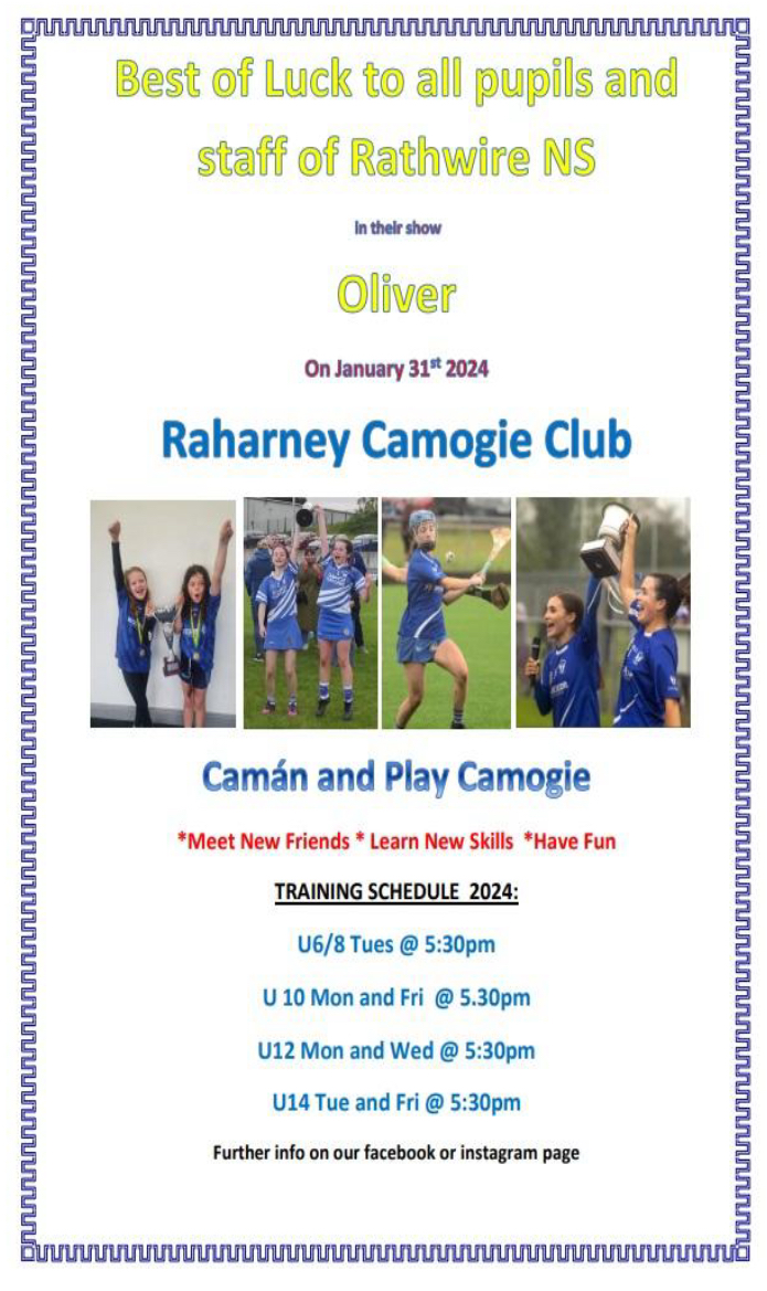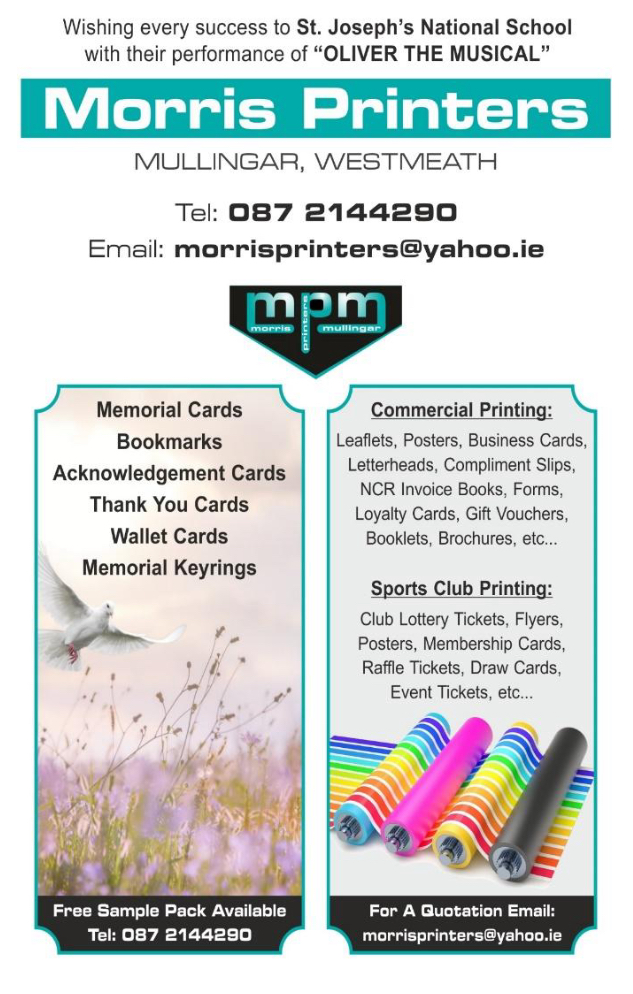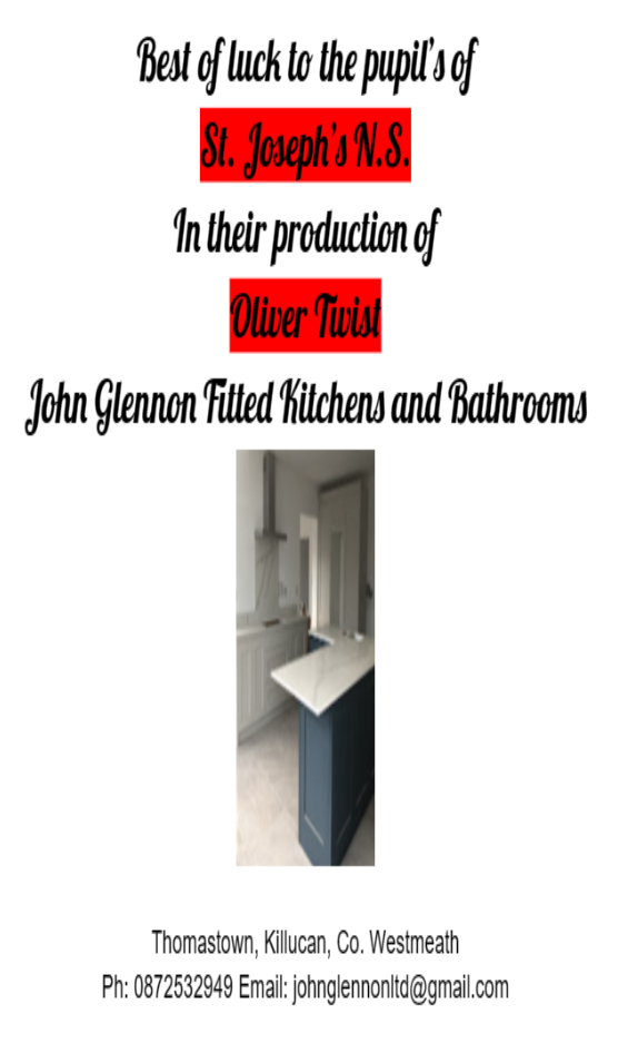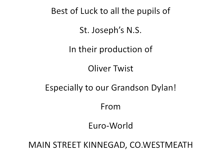 Well done to all of the boys and girls from 6th class on an amazing night of drama in the Mullingar Arts Centre. Oliver the musical was an incredible success. Thank you to Sam and Marie who were kind and patient throughout and a huge thank you to all of the SNA's, our wonderful secretary Pat and to all the teachers for their work and support behind the scenes.