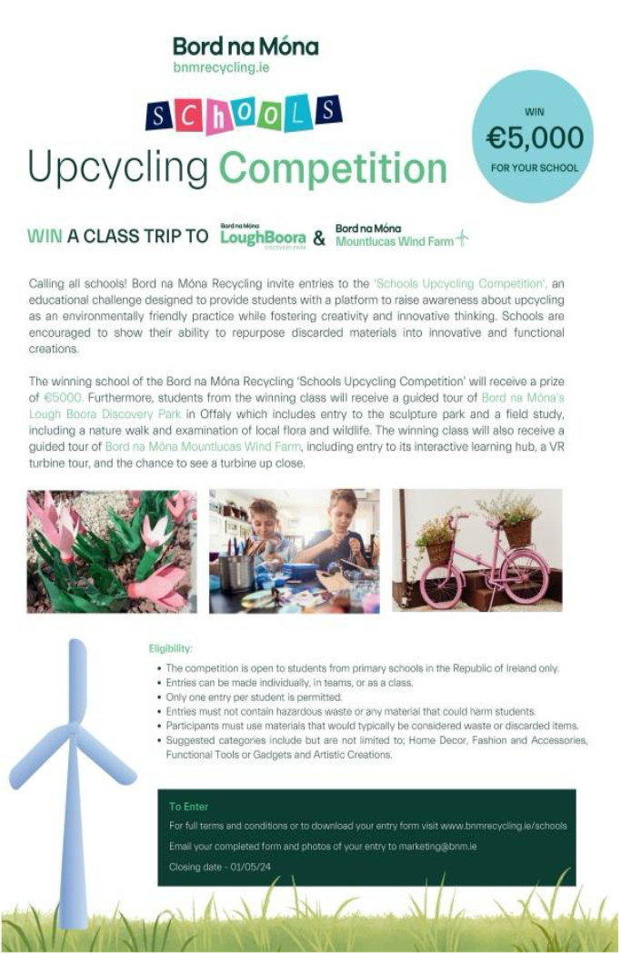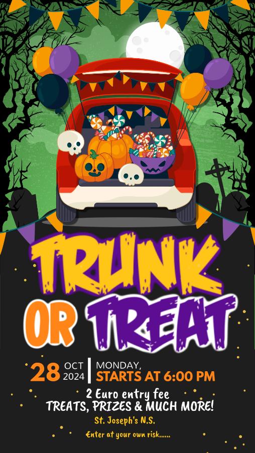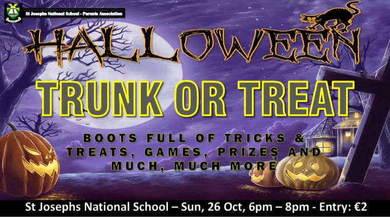 The Parents Association would like to remind you of our upcoming Trunk or Treat event on Sunday 26th of October from 6pm-8pm. We are still looking for volunteers to set up a car or Halloween Stall. Please contact Stephen 0879640997 or Aisling 0872622744, if interested. This is a cash only event. Happy Halloween!!