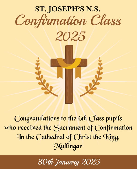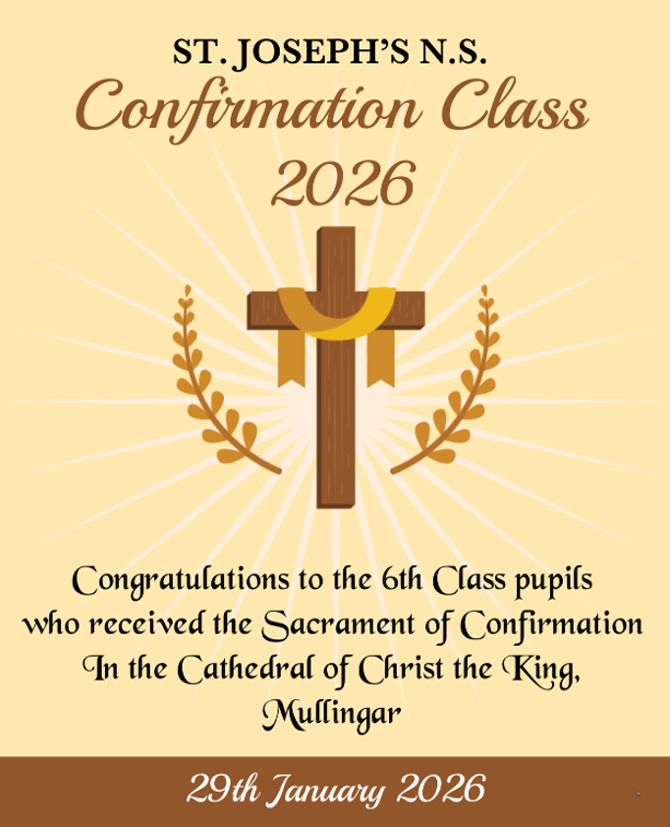 Dear Parents, As you are aware, 6th class will make their confirmation on Thursday the 29th of January 2026. We are busily preparing for our Confirmation and the excitement levels are certainly building. Bishop Tom and Father Stan have kindly put together a letter for our students. Please select the link below to read more and please don't hesitate to contact the school, should you have any queries regarding the confirmation. Father Stan has asked that all students making their confirmation attend weeklymass in preparation for this hugely important sacrament.